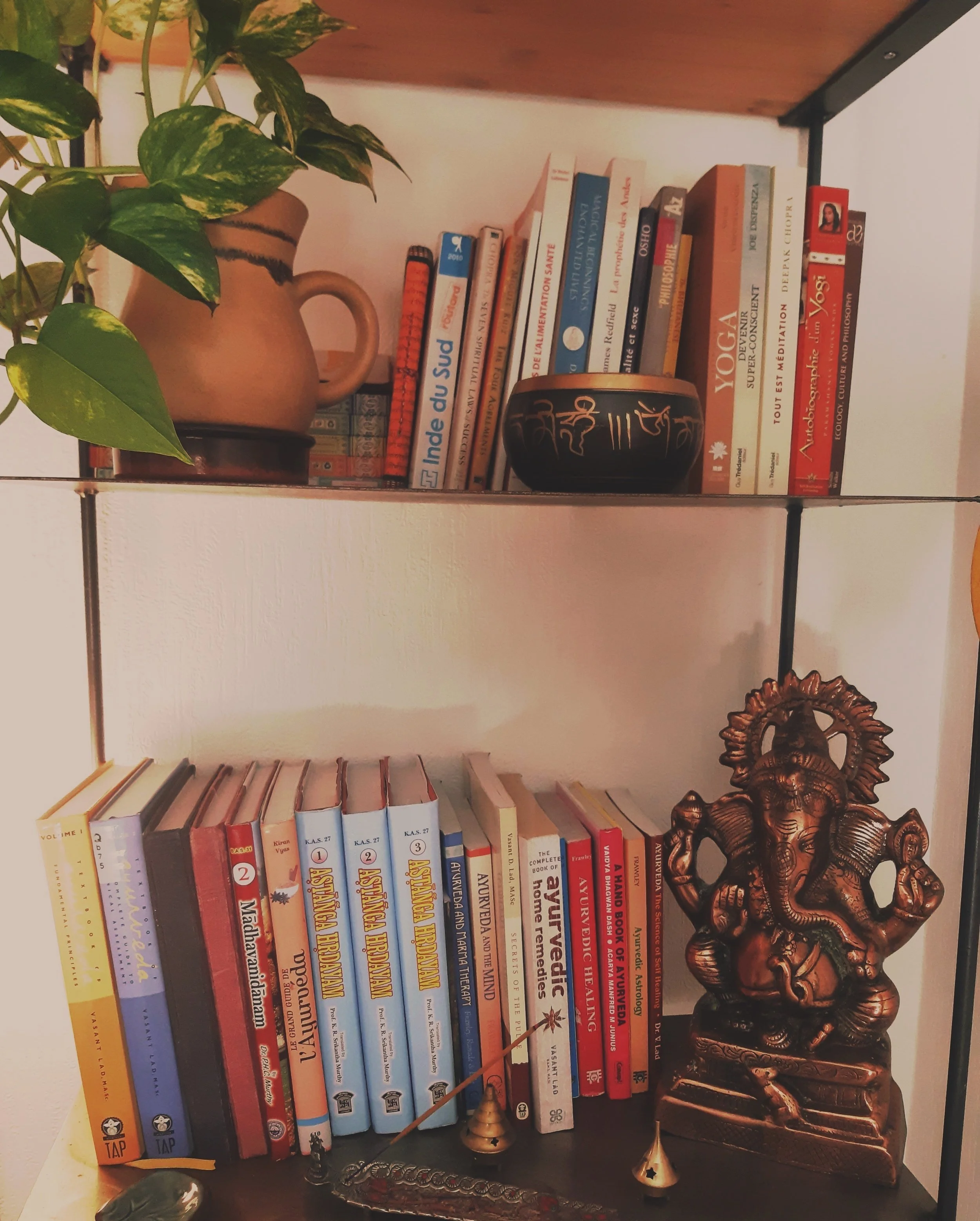 A bookshelf with two shelves containing books, decorative items, and a small plant. The top shelf has books, a ceramic pitcher with a plant, and a small black bowl. The bottom shelf has books, a bronze-colored Ganesha statue, and small brass bells.
